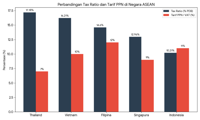 | Negara | Estimasi Tax Ratio (% terhadap PDB) | Tarif PPN / VAT |