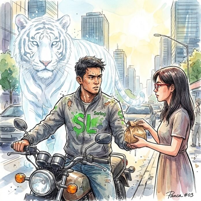 Debu jalanan menempel di kaca helm Panca Saputra saat motor operasional Serlog miliknya berhenti di depan sebuah SD Negeri di pinggiran Jakarta. Jaket abu-abunya yang bersahaja dengan logo SL hijau tampak mencolok di tengah kerumunan orang tua murid yang sedang protes.