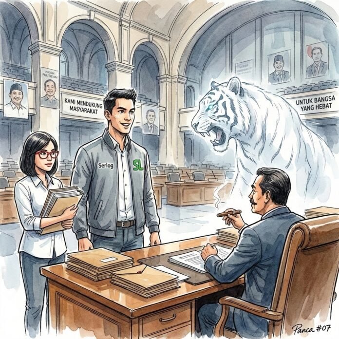 Gedung kura-kura di Senayan itu tampak megah, namun di dalamnya, lorong-lorong ruang komisi terasa sunyi dari perdebatan substansi. Panca Saputra melangkah melewati pos penjagaan, mengenakan jaket Serlog abu-abu yang sudah mulai kusam. Tubuh tegapnya yang setinggi 180 sentimeter tetap berdiri tegak meski ia membawa tas logistik yang cukup berat. Matanya yang cerah memperhatikan barisan papan bunga ucapan selamat dan foto-foto besar para anggota dewan yang terpajang di sepanjang selasar.