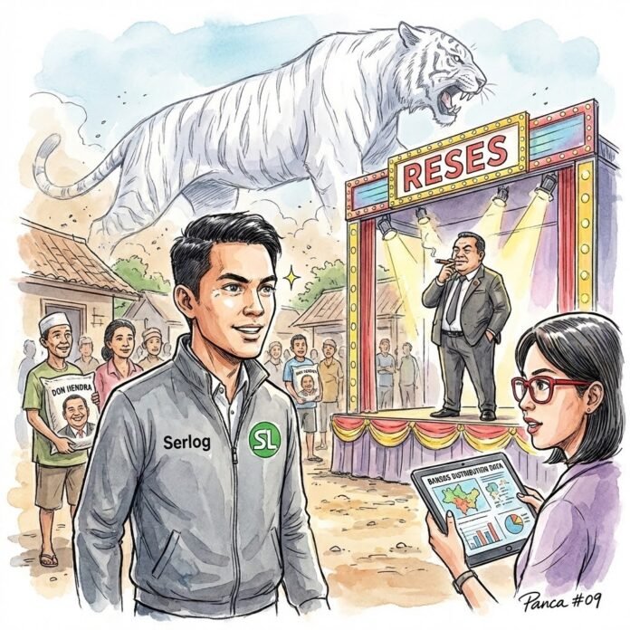 Di tengah lapangan, sebuah panggung megah berdiri dengan spanduk raksasa bertuliskan: “Masa Reses: Menyerap Aspirasi dan Penyaluran Bantuan Sosial Strategis”. Namun, Panca tidak melihat adanya dialog substansi. Yang ia lihat adalah pembagian paket Bansos berupa beras dan minyak goreng dalam kemasan plastik yang ditempeli stiker wajah anggota dewan setempat, anak buah setia Hendra Wijaya. Musik dangdut berdentum keras, menenggelamkan keluhan warga tentang nama mereka yang mendadak hilang dari daftar penerima bantuan sejak megaproyek anggaran 335 triliun itu dialokasikan.