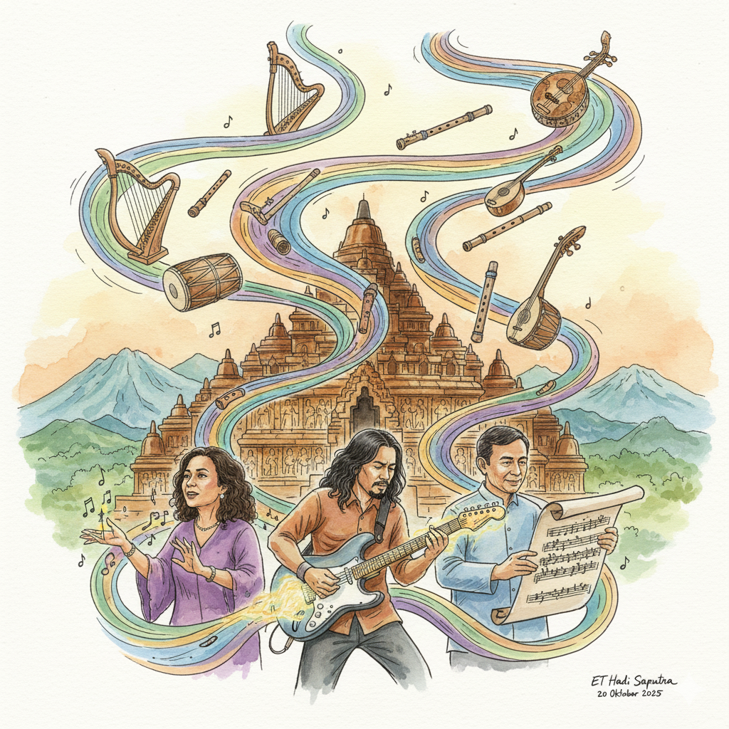Bayangkan Trie Utami. Seniman cerdas ini, yang awalnya cuma mencari arti pulang kampung di Borobudur, justru menemukan harta karun di relief Karmawibhangga (relief kaki candi yang tersembunyi). Di sana, ia melihat—bukan sekadar gambar—tapi instrumen musik kuno yang sangat detail: kecapi, harpa, seruling, dan berbagai jenis gendang.